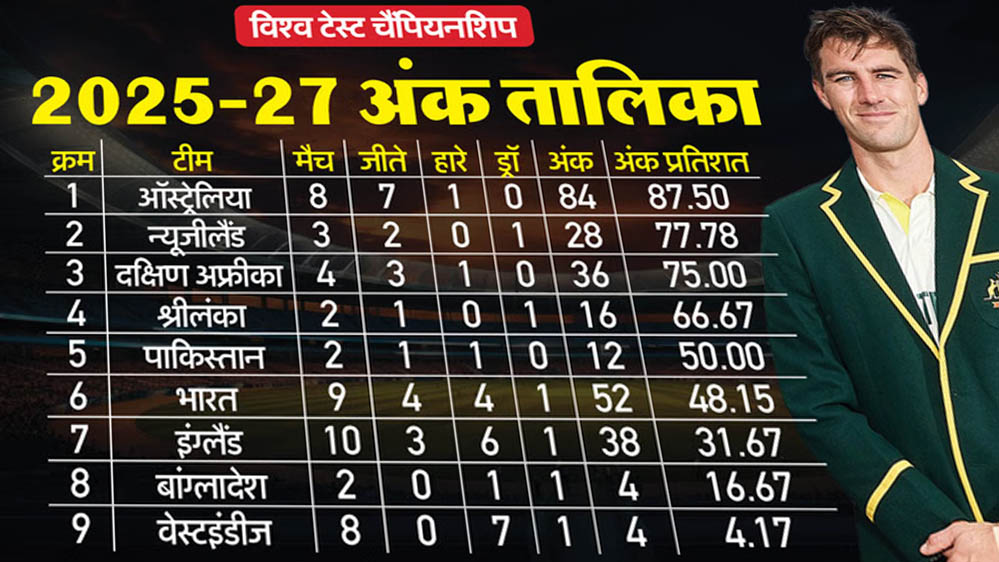 आईसीसी विश्व टेस्ट चैंपियनशिप (WTC) 2025-27 के पॉइंट्स टेबल में ऑस्ट्रेलिया ने इंग्लैंड पर सिडनी में मिली जीत के बाद शीर्ष पर अपनी पकड़ और मजबूत कर ली है। दूसरी ओर इंग्लैंड की स्थिति भारत से भी खराब है, जबकि भारत फिलहाल छठे स्थान पर है।