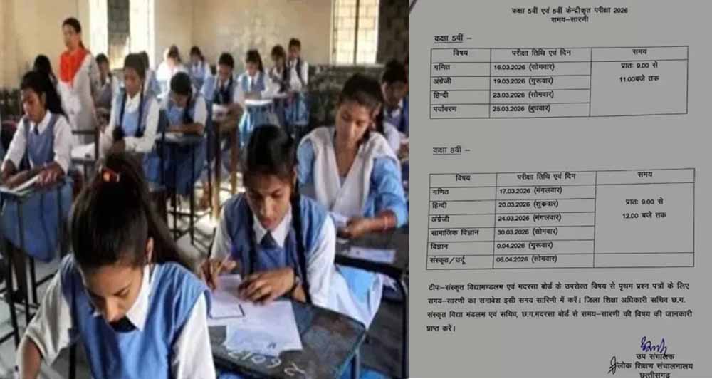 छत्तीसगढ़ लोक शिक्षा संचालनालय ने कक्षा 5वीं और 8वीं की वार्षिक परीक्षा की समय सारिणी जारी कर दी है. इस बार परीक्षाएं बोर्ड पैटर्न में आयोजित की जाएगी. जारी एग्जाम शेड्यूल में  5वीं कक्षा की 16 मार्च और 8वीं कक्षा की 17 मार्च से वार्षिक परीक्षा (Final Examination Schedule) आयोजित होंगी.