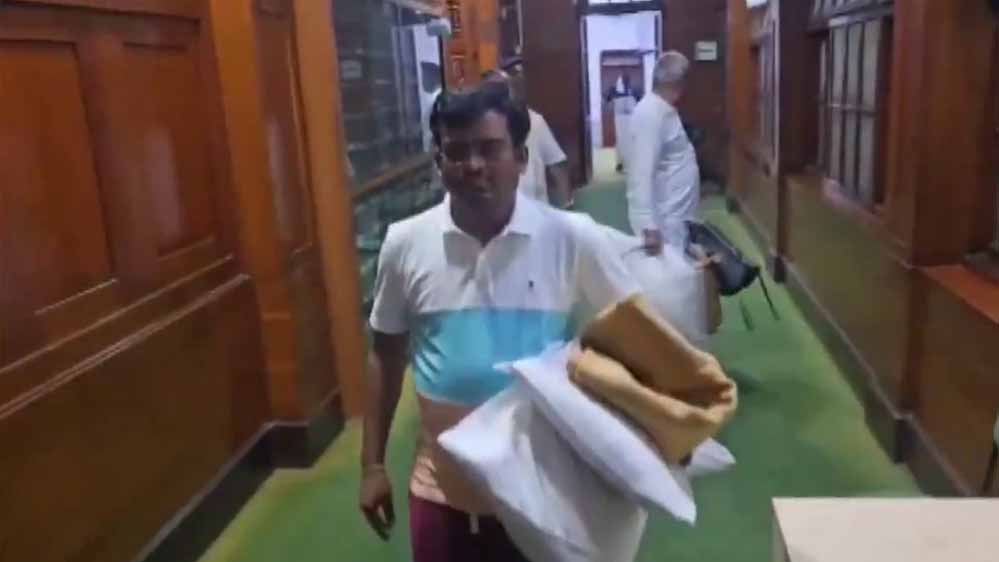 भारतीय जनता पार्टी (भाजपा) और जनता दल-सेक्युलर (जेडीएस) के विधायकों ने कथित शराब घोटाले को लेकर आबकारी मंत्री आरबी थिम्मापुर के खिलाफ प्रदर्शन करते हुए कर्नाटक विधानसभा में रात गुजारी। बुधवार सुबह भी भाजपा-जेडीएस विधायकों का प्रदर्शन जारी रहा। कर्नाटक भाजपा के अध्यक्ष व विधायक बीवाई विजयेंद्र और विपक्ष के नेता आर. अशोक समेत कई विधायक विधानसभा परिसर में मॉर्निंग वॉक करते हुए नजर आए। बाद में सभी विधायक एक जगह इकट्ठा हुए, चाय पी और आगे की कार्रवाई पर चर्चा की। कुछ देर बाद विरोध प्रदर्शन फिर से शुरू हुआ, जिसमें भाजपा और जेडीएस के विधायक विधानसभा के प्रवेश द्वार की सीढ़ियों पर बैठ गए और एक्साइज मंत्री के इस्तीफे की मांग करते हुए नारे लगाए। उन्होंने गाने भी गाए और 'भारत माता की जय' के नारे लगाए।