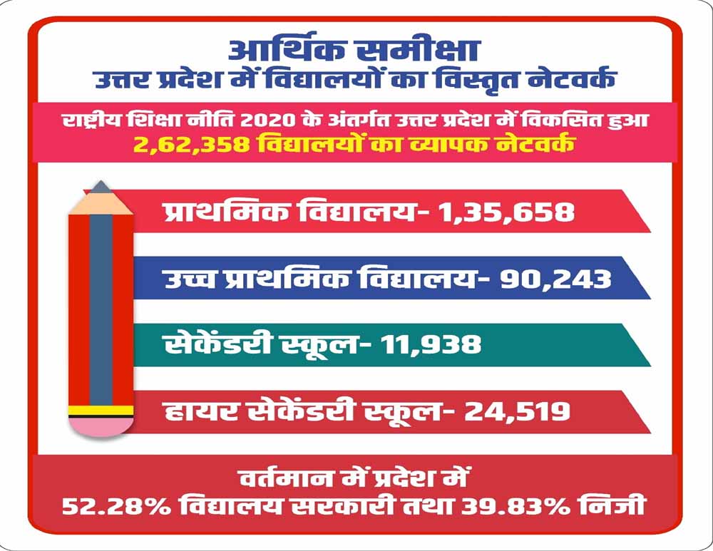 केन्द्र की राष्ट्रीय शिक्षा नीति-2020 को उत्तर प्रदेश में क्रियान्वित करने और सबके लिए शिक्षा को सुलभ बनाने के लिए 2 लाख 62 हजार 358 विद्यालयों का एक विस्तृत नेटवर्क तैयार किया गया है। इनमें 1 लाख 35 हजार 658 प्राथमिक, 90 हजार 243 उच्च प्राथमिक, 11 हजार 938 सेकेंडरी, 24 हजार 519 हायर सेकेंडरी स्कूल शामिल हैं। वहीं प्रधानमंत्री स्कूल फॉर राइजिंग इंडिया (पीएमश्री) योजना के अंतर्गत प्रदेश के 1722 विद्यालयों का चयन किया गया जिन्हें "हरित विद्यालय" के रूप में विकसित किया जा रहा है।