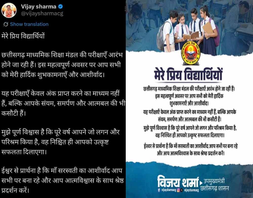उपमुख्यमंत्री  विजय शर्मा ने छत्तीसगढ़ माध्यमिक शिक्षा मंडल की आगामी बोर्ड परीक्षाओं के पूर्व विद्यार्थियों को शुभकामनाएँ दी हैं। उन्होंने अपने एक्स अकाउंट पर विद्यार्थियों को दिए शुभकामना संदेश में सभी परीक्षार्थियों को संबोधित करते हुए कहा कि प्रिय विद्यार्थियों छत्तीसगढ़ माध्यमिक शिक्षा मंडल की परीक्षाएँ आरंभ होने जा रही हैं। इस महत्वपूर्ण अवसर पर आप सभी को मेरी हार्दिक शुभकामनाएँ और आशीर्वाद। यह परीक्षाएँ केवल अंकउ प्राप्त करने का माध्यम नहीं हैं, बल्कि आपके संयम, समर्पण और आत्मबल की भी कसौटी हैं।
