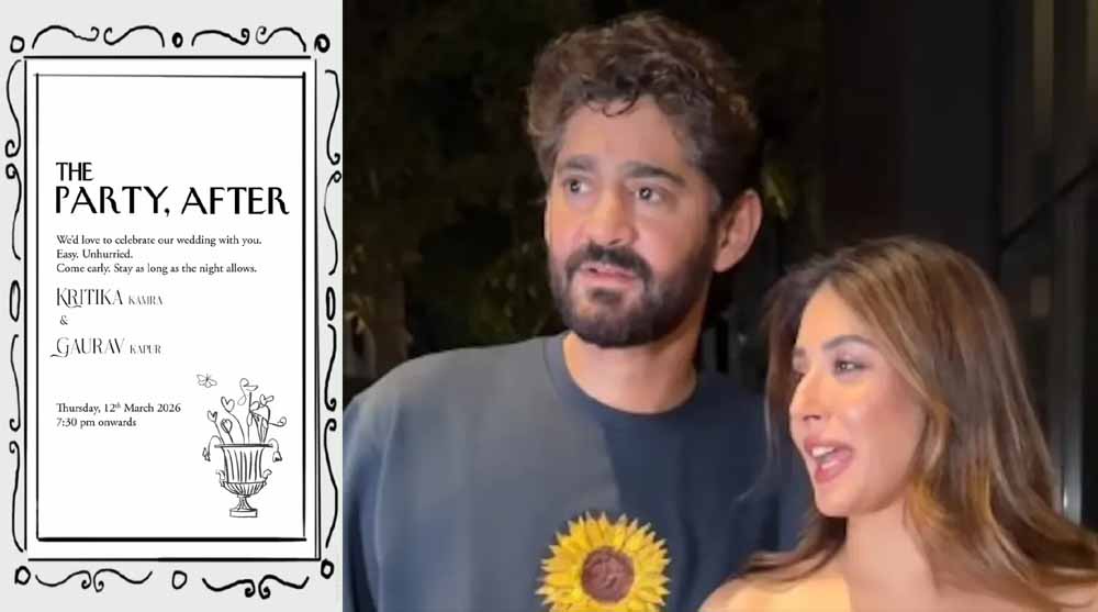 कृतिका कामरा और गौरव कपूर ने के इस इन्विटेशन कार्ड में 12 मार्च को एक आरामदायक, बिना हड़बड़ी वाली आफ्टर-पार्टी की प्लानिंग की गई है। इस कार्ड में 'द पार्टी, आफ्टर' लिखते हुए कहा गया है, 'हम अपनी शादी की खुशियों को आपलोगों के साथ सुकून से सेलिब्रेट करना चाहते हैं। जल्दी आइए और जितनी देर रात तक रुक सकें रुकिए।' ये आफ्टर पार्टी 12 मार्च को 7:30 बजे शाम से शुरू होगी।