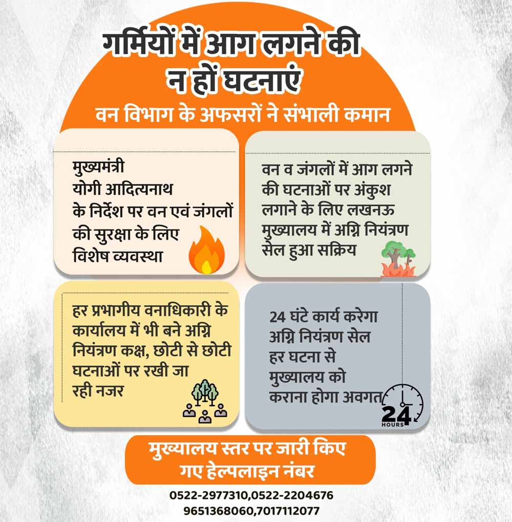 मौसम में परिवर्तन के साथ ही मुख्यमंत्री योगी आदित्यनाथ के निर्देश पर वन विभाग ने आग से बचाव की तैयारी पूरी कर ली है। मुख्यमंत्री ने वन विभाग के आलाधिकारियों से कहा है कि गर्मी में जंगलों में आग की घटनाएं न हों, इसके लिए अभी से तैयार रहें। वन विभाग ने ऐसी घटनाओं पर निगरानी और रोकथाम के लिए मुख्यालय से लेकर प्रभागीय स्तर, जोनल-मंडलीय मुख्य वन संरक्षक स्तर पर नियंत्रण कक्ष बनाया है। प्रदेश मुख्यालय पर बनाए गए अग्नि नियंत्रण सेल कार्य कर रहे हैं।