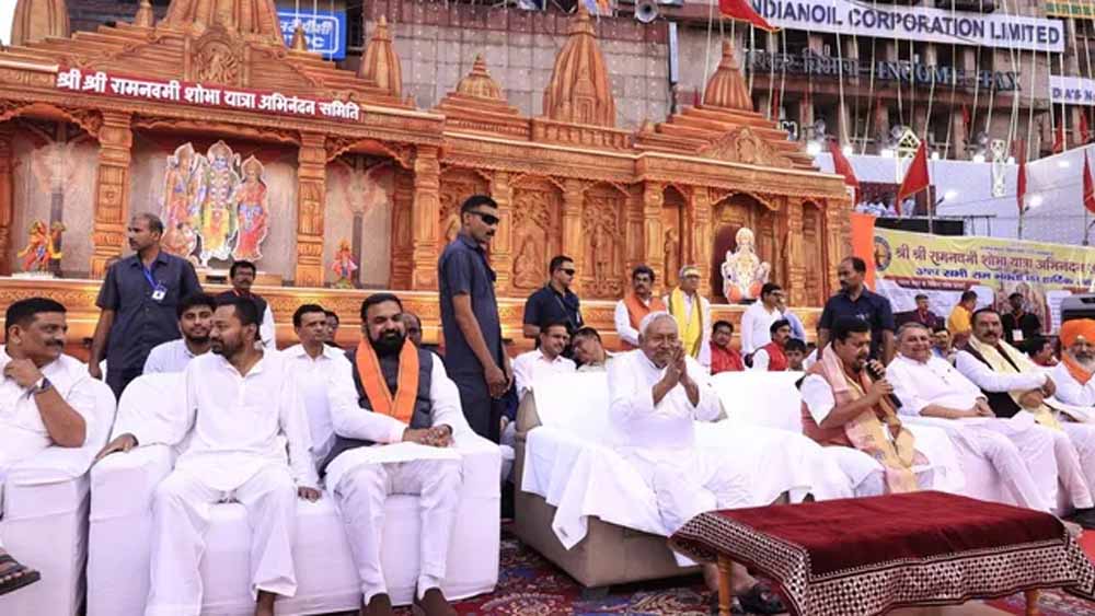 भाजपा के राष्ट्रीय अध्यक्ष नितिन नवीन ने मंच पर मौजूद सभी नेताओं का गर्मजोशी से स्वागत किया। मुख्यमंत्री नीतीश कुमार और नितिन नवीन द्वारा वहां पहुंच रही झांकियों को सम्मानित किया जा रहा है। नीतीश कुमार के मंच पर चढ़तेही जय श्री राम के नारे लगने लगे।