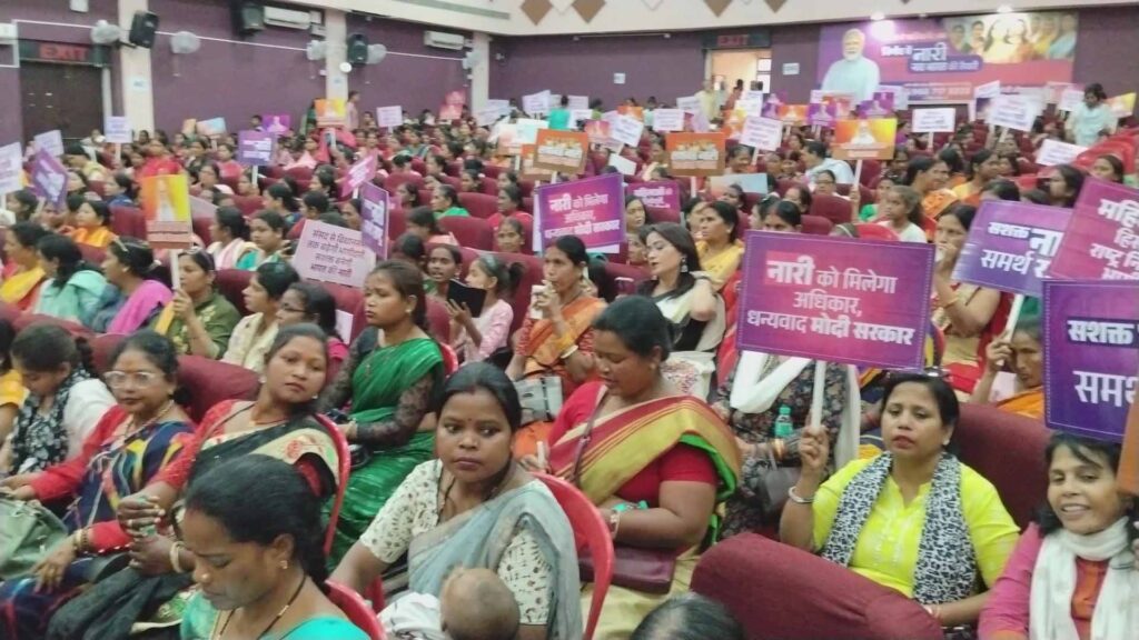 झारखंड के रांची में नारी शक्ति वंदन अधिनियम पर मंगलवार को आर्यभट्ट सभागार मोरहाबादी में सम्मेलन हुआ. इसमें हजारों महिलाएं शामिल हुईं. पूरा हॉल महिलाओं से खचाखच भरा था. नारी शक्ति वंदन अधिनियम को लेकर मौजूद जनसमूह ने पीएम नरेंद्र मोदी के प्रति आभार व्यक्त किया. ‘पंचायत से पार्लियामेंट तक, निर्णय में नारी, नव भारत की तैयारी’ थीम पर आधारित यह कार्यक्रम पूरी तरह से नारी शक्ति को समर्पित रहा.