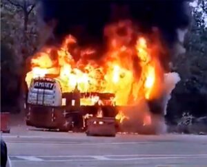 हादसे के बाद लगी बस में आग, डीटीसी बस और मोटरसाइकिल का हादसा, यात्री सुरक्षित